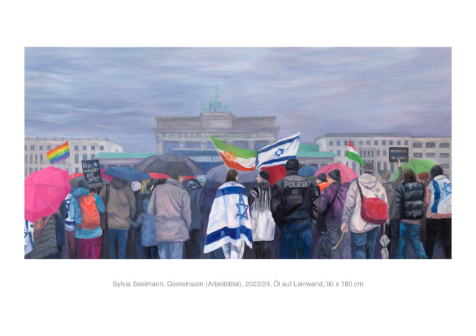 Der zweite Preis war ebenso mit 1.000 Euro dotiert wie der dritte Preis, der an Sylvia Seelmann für Ihr Gemälde „Gemeinsam“ ging. Die Arbeit zeigt die Situation eines Demonstrationszugs vor dem Brandenburger Tor, wobei ein Demonstrant die Landesfahnen Israels und Irans mit einem Knoten miteinander verbunden trägt.
